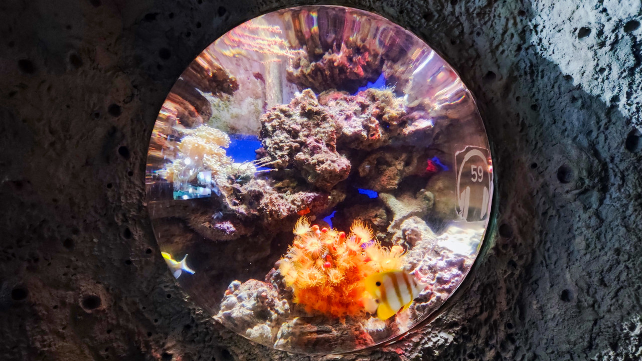 В кадре показано круглое смотровое окно аквариумной стены, за которым видна коралловая конструкция и яркая морская фауна. Внутри выделяются ветвистые кораллы и полипы, а также несколько рыб, движущихся на переднем плане. Стена вокруг окна выполнена под фактурный камень, что имитирует подводную расщелину. Кадр может использоваться в материалах о морских экосистемах, музейных и выставочных проектах, визуальных курсах о коралловых рифах и презентациях, посвящённых сохранению морского биоразнообразия.