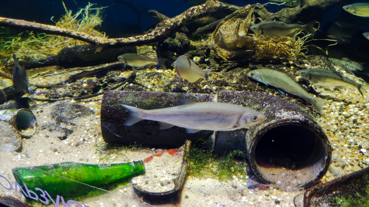 Изображение фиксирует подводную экспозицию с пресноводными рыбами, исследующими пространство вокруг обросшей ржавчиной металлической трубы и стеклянных фрагментов на дне. По окружению заметно присутствие старых бутылок, органических остатков и песчаной отсыпки, что визуализирует последствия длительного загрязнения. Экспозиция напоминает участок реки или водохранилища, где отходы сохраняются годами. Такой кадр уместен в статьях и отчётах об экологии водных систем, иллюстрациях к проектам о снижении бытового мусора и тематических выставках.