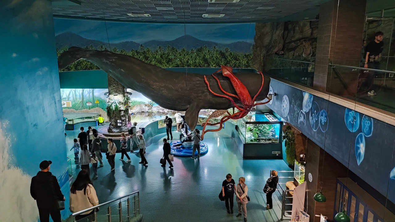 Снимок показывает интерьер крупной экспозиционной зоны океанариума, где над залом установлена масштабная модель кашалота, схваченного гигантским кальмаром. Внизу по залу движутся посетители, часть витрин расположена вдоль стены. Подобные инсталляции иллюстрируют реальные морские конфликты в природе и используются для наглядного показа пищевых цепочек. Помещение оформлено как образовательное пространство и служит для визуализации биологии морских экосистем. Фото может использоваться в учебных материалах, статьях о музейной педагогике и рекреационном дизайне.
