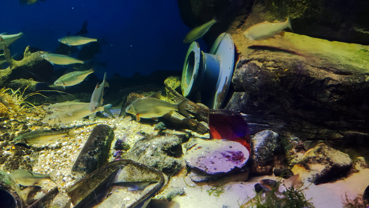На фото изображён участок аквариумной экспозиции, имитирующий загрязнённое донное пространство, где рядом с плавающей рыбой расположены части большого катушечного барабана и фрагменты мусора. Песчаное основание и камни усиливают иллюзию реального русла, в которое попали техногенные отходы. Экспозиция создана как визуальный пример негативного влияния хозяйственной деятельности на водоёмы. Изображение можно использовать в материалах об экологии и антропогенном воздействии, в учебных пособиях и тематических докладах.