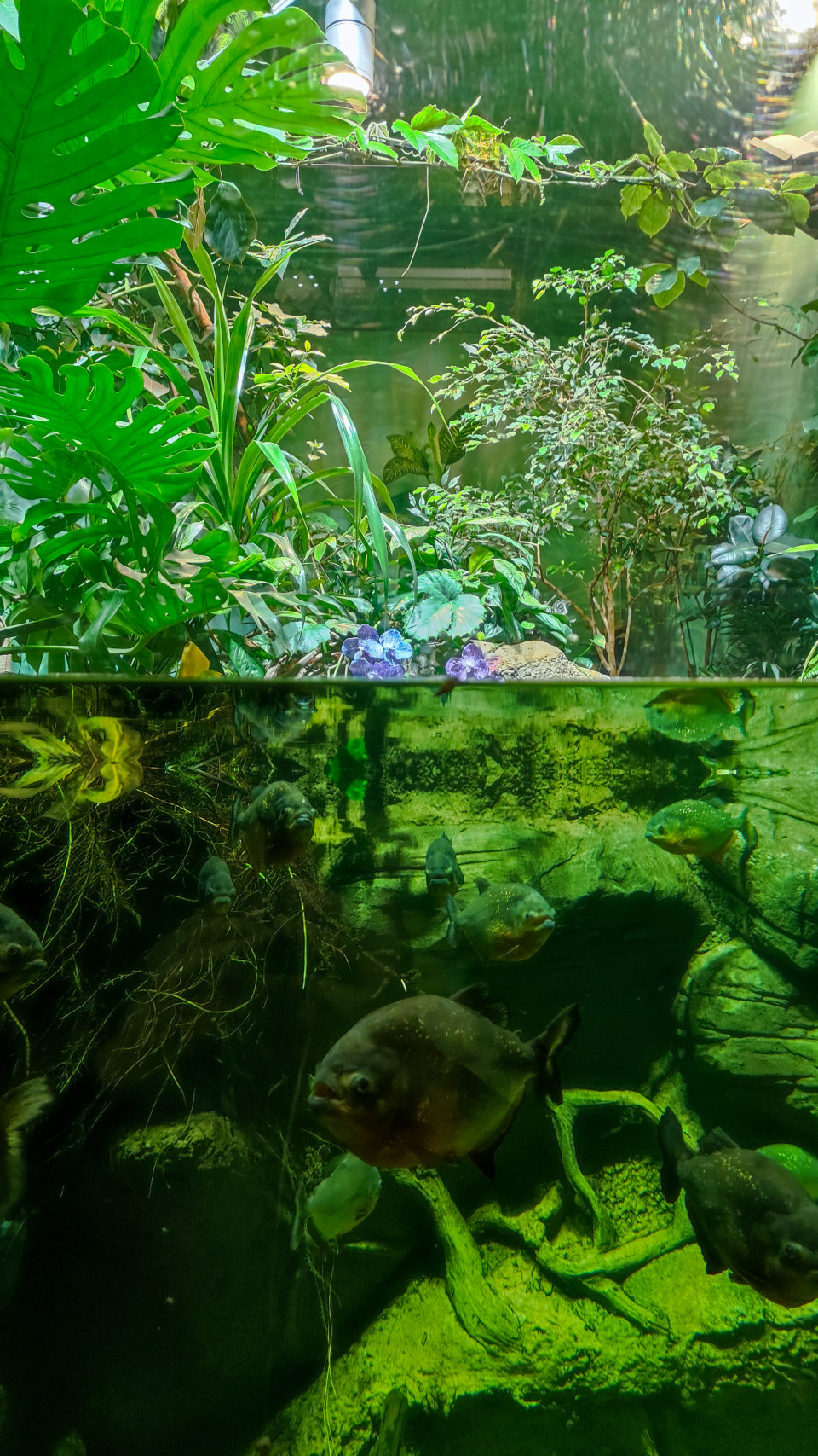 Вертикальный снимок демонстрирует разрез аквариумной экспозиции: верхняя часть кадра показывает густую растительность и декоративные лианы, имитирующие тропический берег, а нижняя часть — подводное пространство с рыбой, плавающей среди коряг и тени растений. Поверхность воды визуально разделяет два уровня среды, подчеркивая разницу между прибрежной и подводной экосистемой. Этот тип экспозиции используется в музейных пространствах и океанариумах для наглядного показа взаимосвязи флоры и фауны. Снимок подходит для учебных материалов и презентаций о биотопах влажных тропических зон.