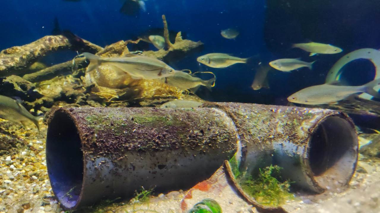 Снимок показывает участок пресноводной аквариумной экспозиции, где в кадре видны проржавевшие трубы, иллюстрирующие загрязнённое донное пространство, а также стекло и водоросли среди песчаного грунта. Рыбы плавают вдоль поверхностей труб, подчёркивая, как остатки техногенных материалов становятся частью среды. Экспозиция используется для демонстрации влияния отходов на речные экосистемы и может служить иллюстрацией в образовательных публикациях и экологических проектах.