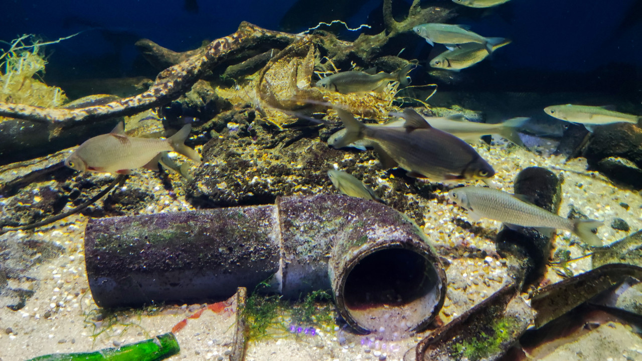 На фотографии показана аквариумная сцена с моделированием загрязнённого дна: на песке лежат ржавые трубы, стеклянные фрагменты и растительные остатки, а среди них плавает несколько пресноводных рыб. Такой экспозиционный подход применяется в природоохранных музеях для демонстрации реального состояния некоторых водоёмов, подвергшихся бытовым отходам. Фото подходит для учебных материалов о загрязнении рек и иллюстраций к экологическим докладам.