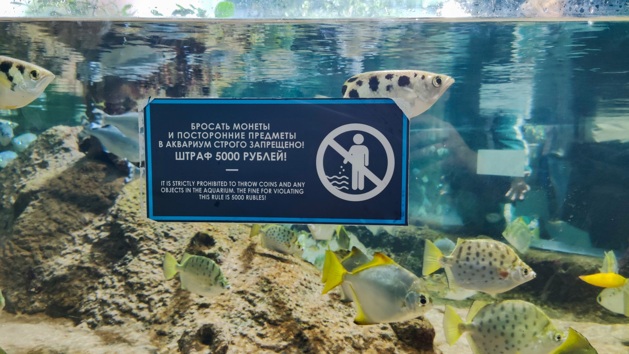 Табличка с запретом бросать предметы в аквариум в «Москвариуме»
