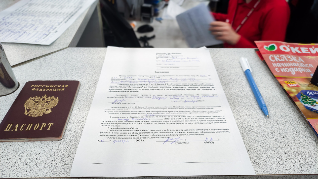 На фотографии показан российский паспорт и заполненное заявление, размещённые на прилавке, рядом лежит шариковая ручка и рекламный буклет. Документ оформлен в рамках обращения в магазин для возврата бытовой техники, предположительно неисправного электрического чайника, что указывает на потребительскую процедуру обмена или возврата по гарантии. На заднем плане находится сотрудник в рабочей форме, но личность не опознается. Снимок можно использовать для иллюстраций в статьях о правах потребителей, возврате товаров и гарантийном обслуживании.