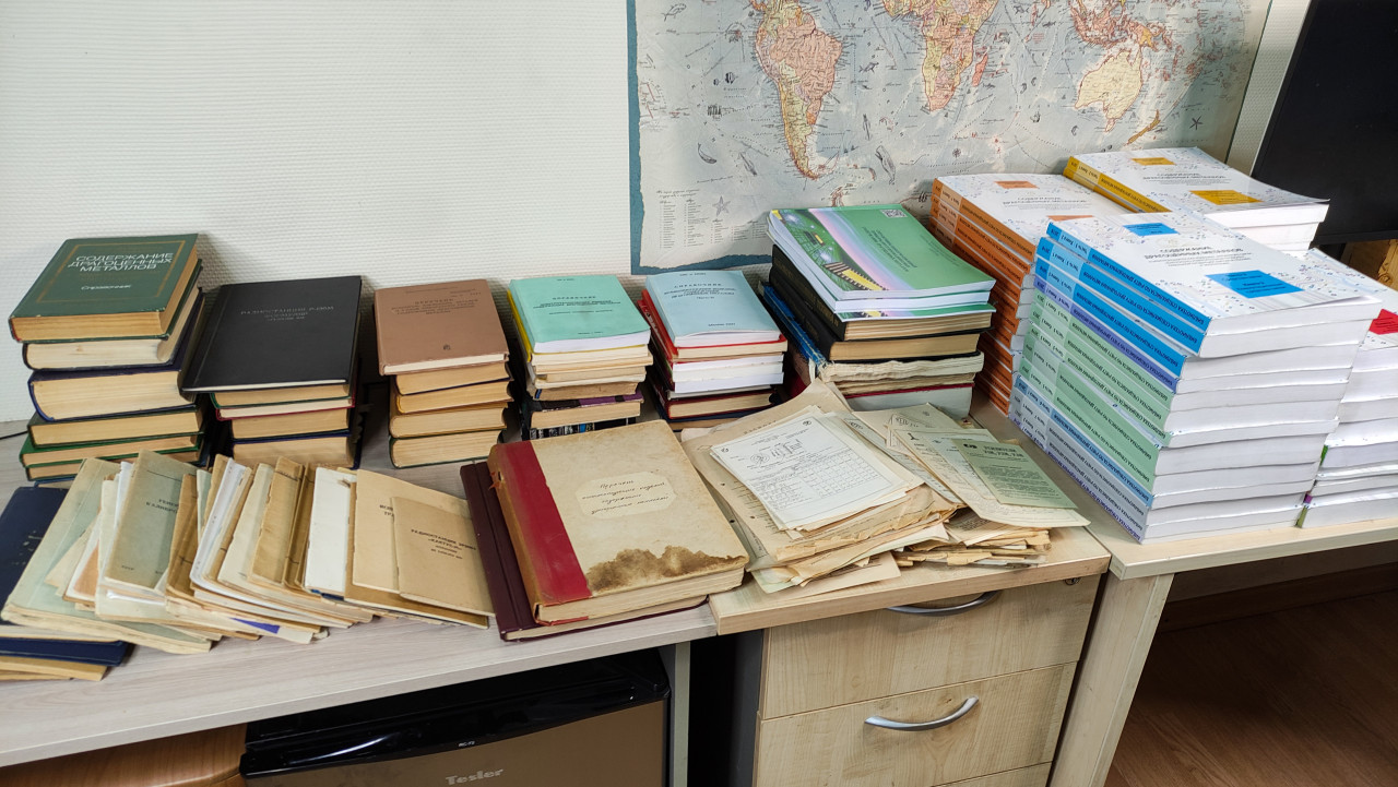 На фото изображён стол, заставленный архивными и современными техническими справочниками, размещёнными в стопках разной высоты. Среди них можно увидеть издания советского периода с пожелтевшими обложками и плотной прошивкой, а также новые книги, посвящённые содержанию драгоценных металлов в электронных компонентах. В верхней части кадра частично видна карта мира на стене, что указывает на рабочее помещение или библиотеку технической организации. Изображение подходит для материалов об инженерной документации, техническом наследии и профессиональной литературе.
