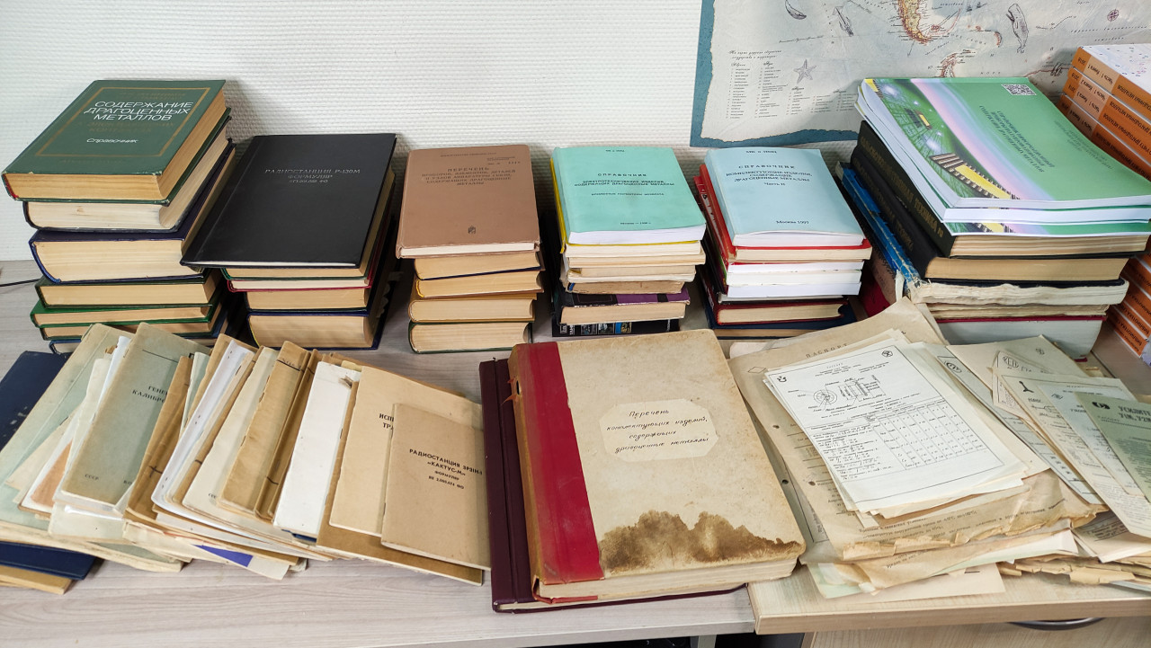 На фото изображены стопки печатных справочников и технических папок, относящихся к различным временным периодам: в нижней части лежат старые издания с потемневшими страницами и архивными пометками, выше располагаются современные технические справочники в новой полиграфии. Комбинация старой и новой литературы свидетельствует о преемственности технических школ. Кадр может использоваться в просветительских материалах, рассказывающих о развитии отраслевой документации.