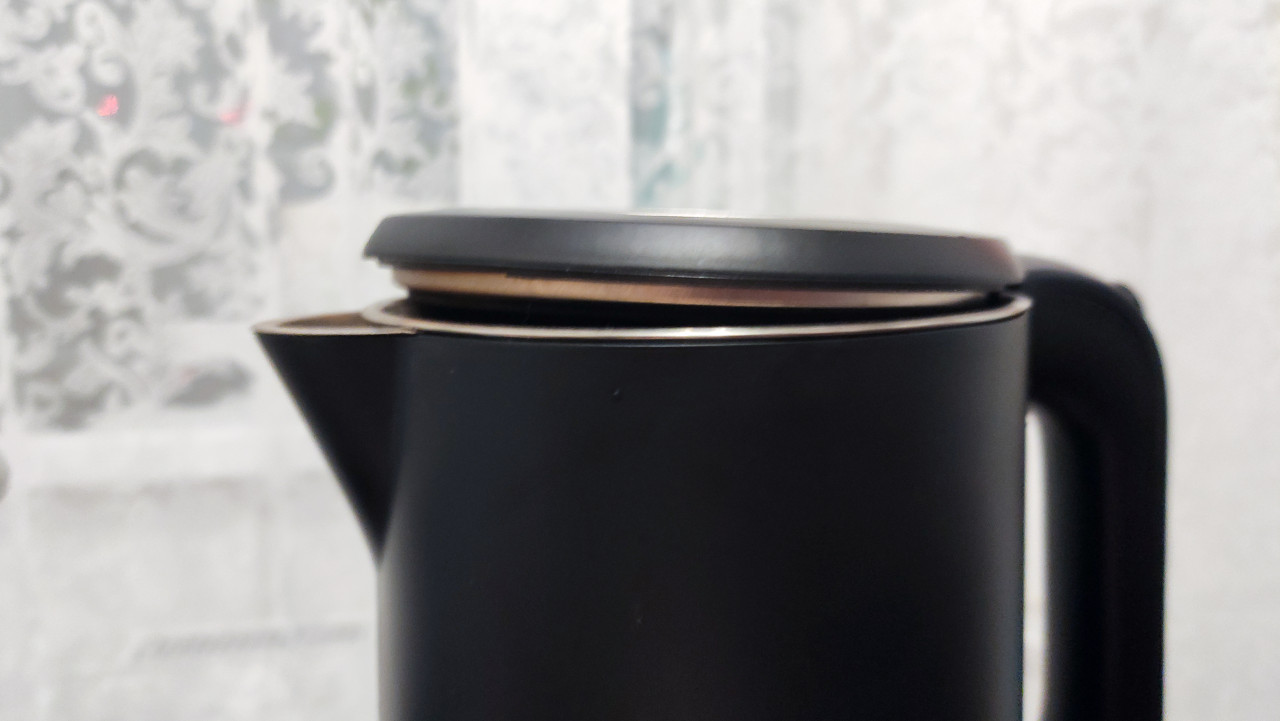 Изображение демонстрирует боковой вид электрического чайника с приподнятой крышкой, размещенного на плоской поверхности возле окна с полупрозрачными занавесками. Видно соединение корпуса и крышки, носик, а также ручка, частично скрытая ракурсом. Отражения света на металле и пластике указывают на искусственное освещение. Кадр выполнен в бытовой среде и может применяться для материалов о безопасности эксплуатации, обзорах кухонных приборов или как тематическая иллюстрация для интернет-каталогов.