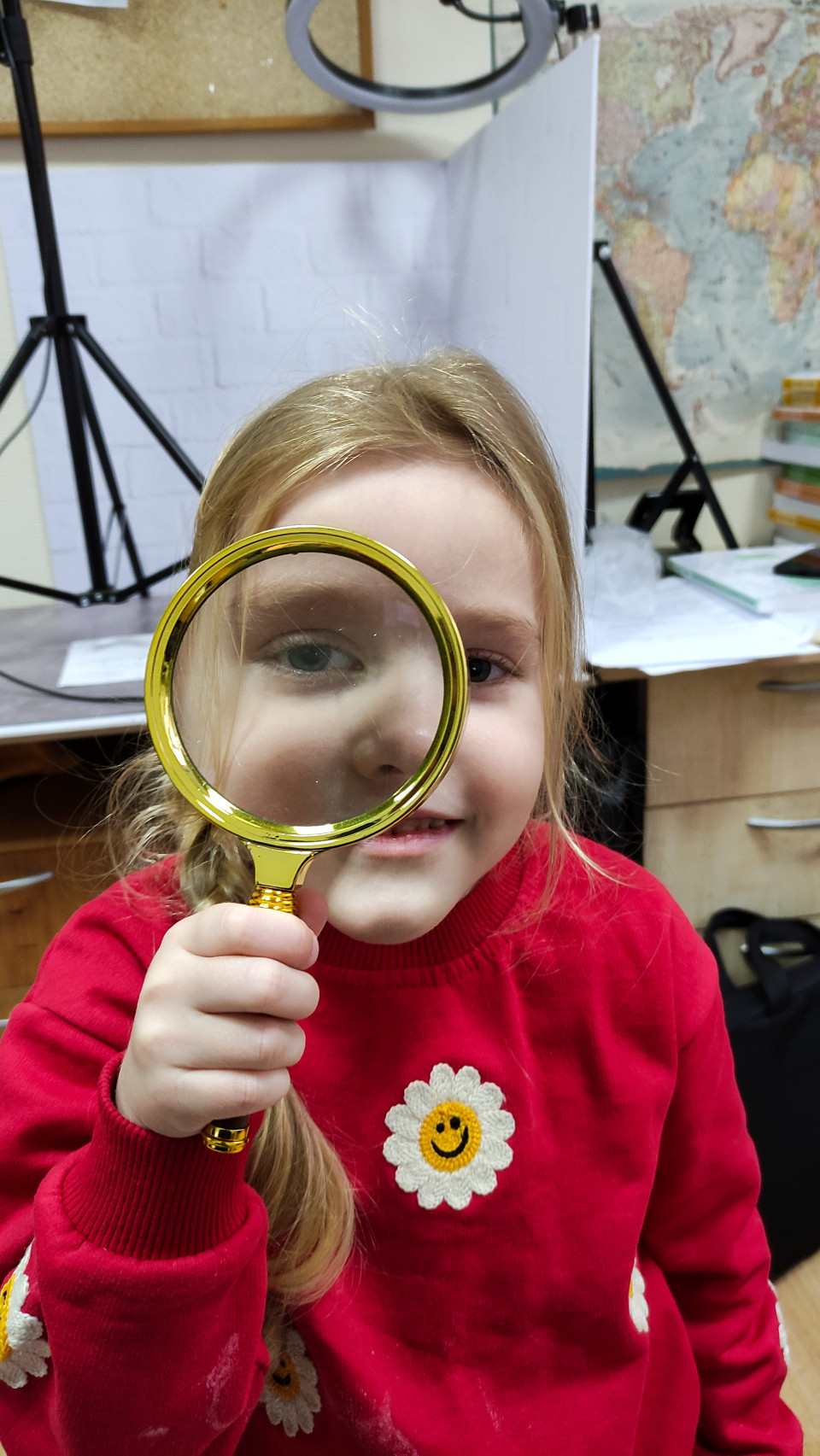 На снимке девочка с русыми волосами и косой держит перед лицом большое увеличительное стекло в золотистой оправе, направляя его на глаз. За ней виден учебный интерьер: стол, карты, настольные лампы и штативы, указывающие на занятия или экспериментальную работу. Яркий свитер с ромашками добавляет кадру акцент. Фото подходит для иллюстраций о детском интересе к науке, школьных проектах, исследовательской деятельности и образовательных инициативах.