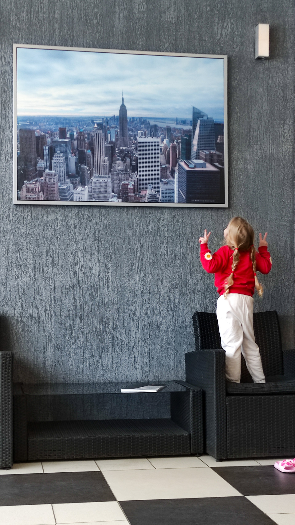 На изображении девочка в красном свитере и светлых брюках стоит на кресле, глядя на большой постер с панорамой Нью-Йорка, где виден Эмпайр-стейт-билдинг. Интерьер современный, с серой стеной, черно-белой плиткой и мебелью из ротанга. Сцена передает детское воображение и интерес к большим городам. Фото подходит для тем о путешествиях, мечтах, развитии и визуальных ассоциациях с архитектурой мегаполисов.