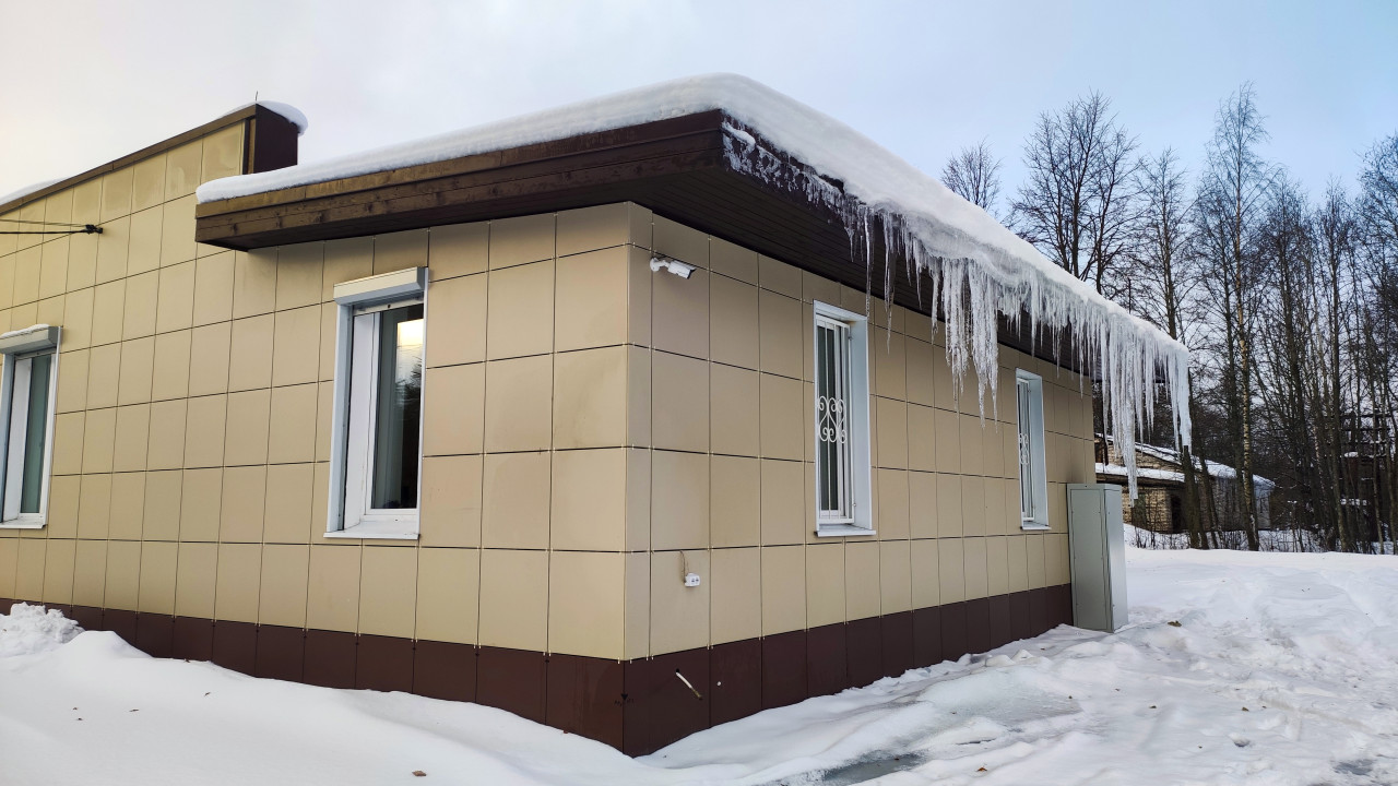 На фотографии зафиксировано одноэтажное административное здание с металлическими откосами и панельной облицовкой, на краю крыши которого сформировались длинные сосульки и навес из снега. Внизу заметны сугробы и утрамбованная тропа. По стилю отделки это типовой модульный объект, применяемый для офисов или вспомогательных помещений. Снимок иллюстрирует последствия циклона и нерегулярной очистки кровли, полезен для материалов о зимней безопасности, рисках падения льда и регламенте содержания зданий.