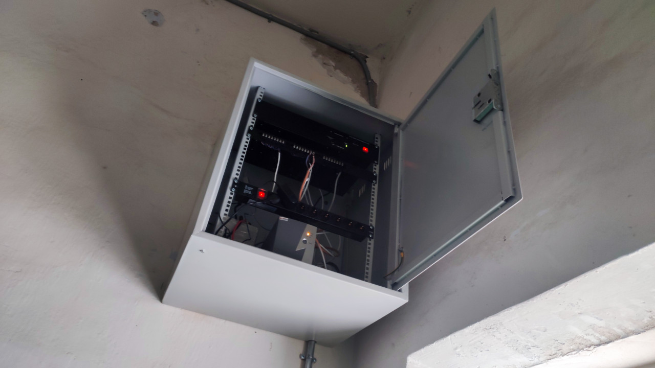 На изображении показан металлический телекоммуникационный шкаф, установленный высоко на стене в подъезде жилого дома; дверца открыта, внутри видны сетевые кабели, питание и блоки коммутации. Состояние стен и размещение оборудования указывают на модернизацию инженерных сетей без капитальной реконструкции здания. Такое оборудование применяется для связи, интернет-доступа и распределения сигнала между квартирами. Фотография может быть использована в публикациях о телекоммуникациях, обслуживании домов и локальной сети.