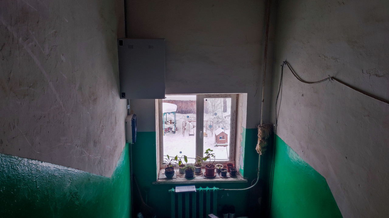 На снимке показан лестничный пролёт советского многоквартирного дома с типичной отделкой стен зелёной и белой краской, окном на середине марша и подоконником, на котором стоят несколько горшков с комнатными растениями. Снаружи через стекло виден заснеженный двор и детская площадка. В верхней части стены закреплён телекоммуникационный шкаф и проходят инженерные кабели. Сцена характеризует быт и облик старых подъездов жилых домов середины XX века, распространённых в постсоветских городах и посёлках. Фотография подходит для иллюстраций тем о городской среде, инфраструктуре и повседневной жизни жильцов.