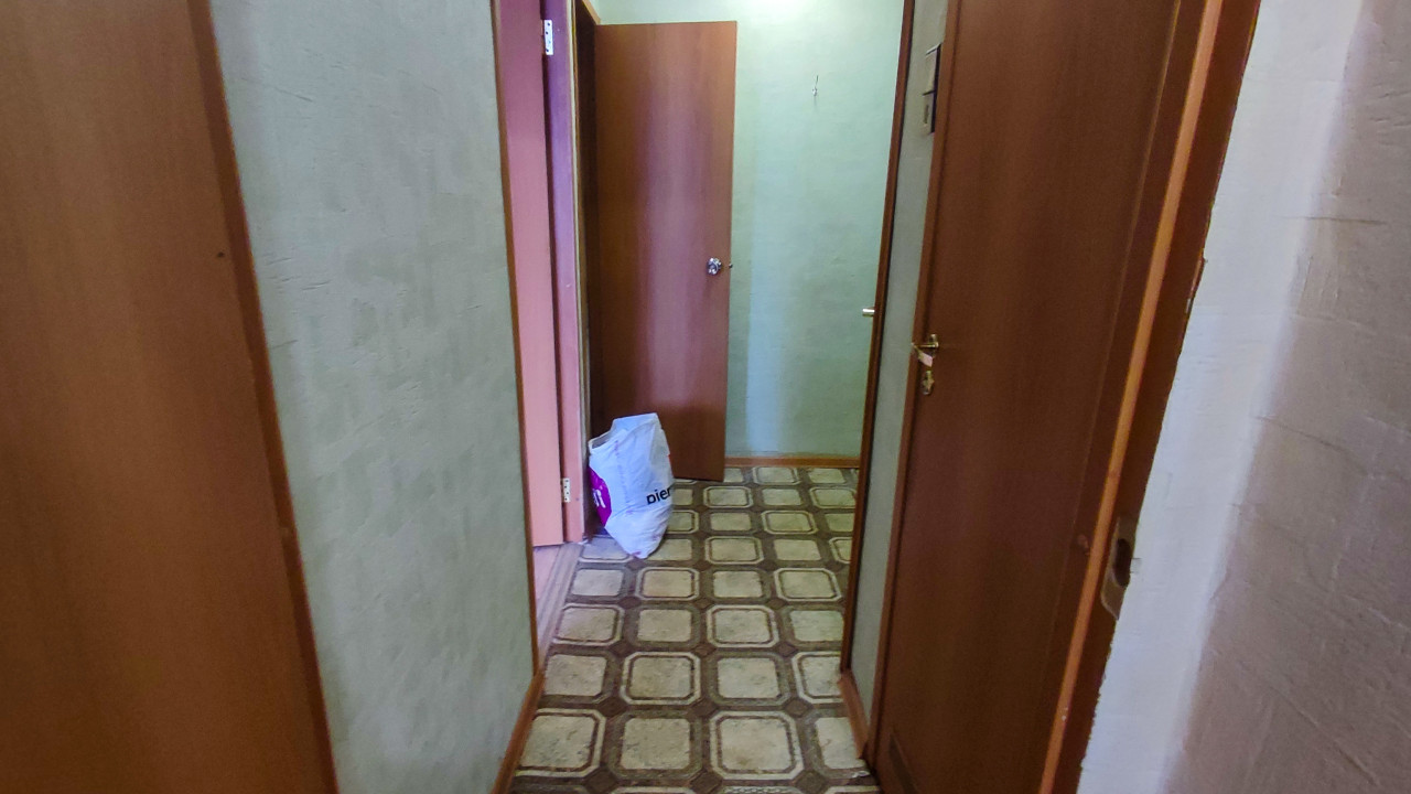 Снимок фиксирует часть проходного коридора, ведущего в несколько помещений, на полу уложен линолеум с характерным узором, виден пакет с вещами и открытые двери комнат. Стены отделаны текстурным покрытием. Архитектурно или исторически значимых деталей нет. Фотография может использоваться для визуализации планировки жилой площади и оценки базового состояния помещений.