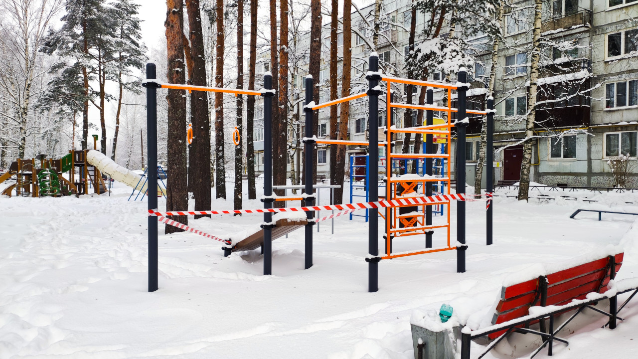 Снимок показывает спортивный комплекс для уличных тренировок, установленный во дворе жилого массива, покрытый снегом и огражденный сигнальной лентой. В глубине кадра видны игровые элементы соседней детской площадки, а также фасады типовых панельных домов. Исторически значимых объектов не наблюдается. Фото можно использовать для иллюстраций городской среды, зимних условий эксплуатации площадок и вопросов благоустройства.