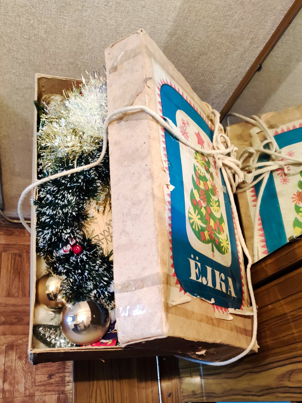 коробка ёлка елочные игрушки советский период новогодний декор традиции ретро украшения мишура стеклянные шары быт праздник домашний интерьер упаковка символика сезонность наследие быта старые вещи ностальгия елочные украшения зима атрибут новогодний набор ретро дизайн хранениеПохожие фотографии