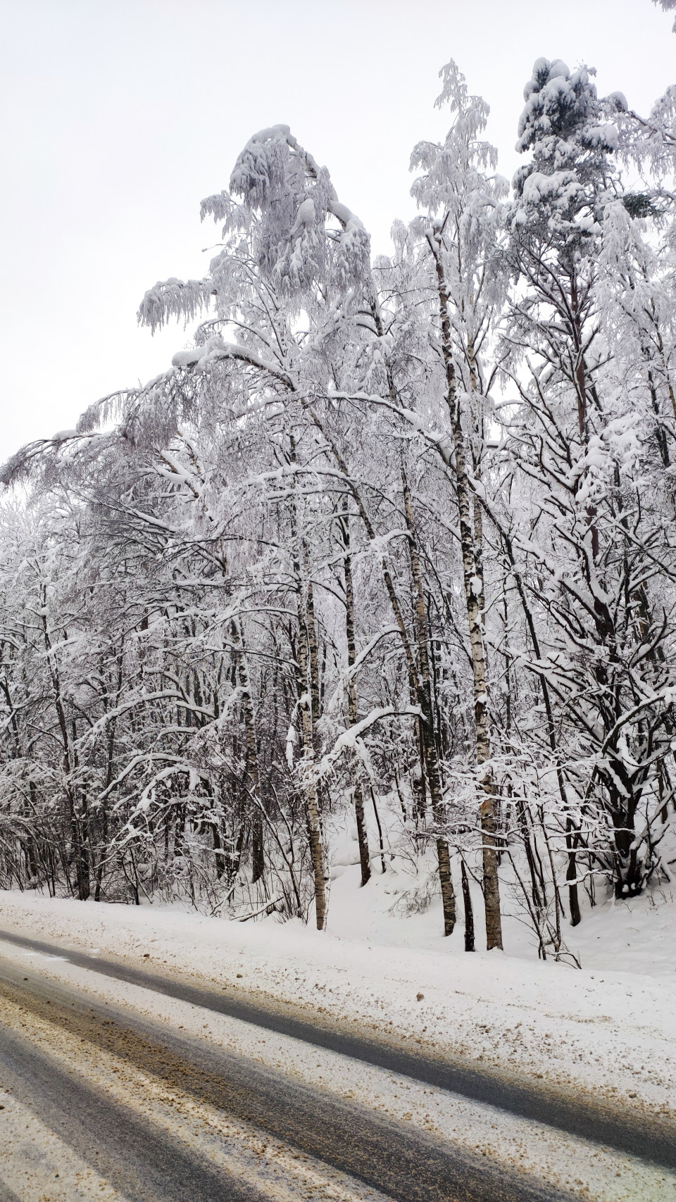 На фотографии видна загородная дорога с обочиной, по которой проходит линия стволов лиственных деревьев, плотным слоем покрытых снегом. Мелкие ветви изгибаются вниз под тяжестью осадков, а вдоль полотна дороги заметны следы противогололёдной обработки. Сюжет иллюстрирует сезонные особенности северных регионов и подходит для использования в материалах о климате, зимней природе, дорожной безопасности и организации транспортного обслуживания в холодных погодных условиях.