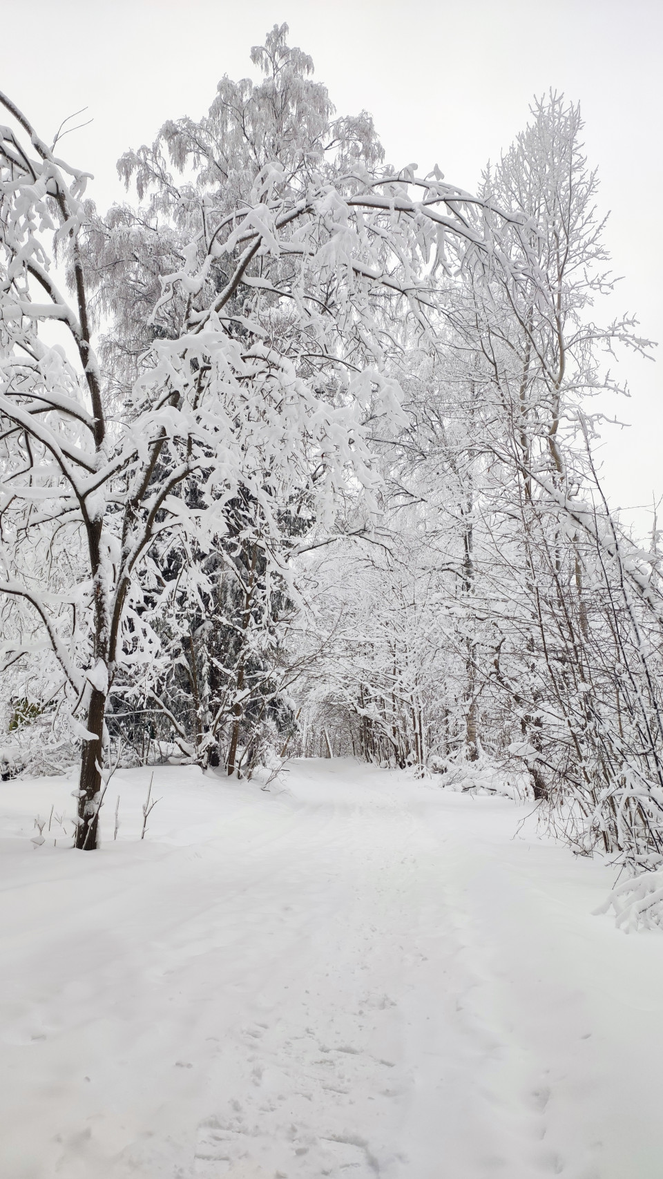 Фотография показывает узкую лесную тропу, уходящую вдаль среди деревьев, густо покрытых снегом. Ветви склоняются к проходу под тяжестью осадков, создавая эффект коридора. Тропа утоптана следами людей, что указывает на пешее использование маршрута. Сцена снята в условиях зимнего дня при рассеянном свете, характерном для северных и умеренных широт. Такой кадр может применяться в материалах о природе, погодных условиях, сезонных изменениях и зимних прогулках.