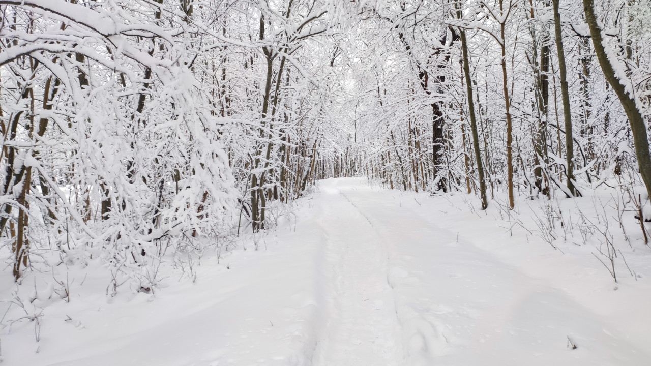 На изображении представлена лесная дорога, проходящая между стволами лиственных деревьев, густо покрытых снегом. Ветви изгибаются внутрь тропы, создавая эффект тоннеля и усиливая перспективу вдаль. Следы на снегу показывают использование пути людьми. Фотография демонстрирует типичную картину зимнего периода в лесной зоне без признаков хозяйственной деятельности. Снимок подходит для статей о природе, туризме и сезонных изменениях в ландшафте.