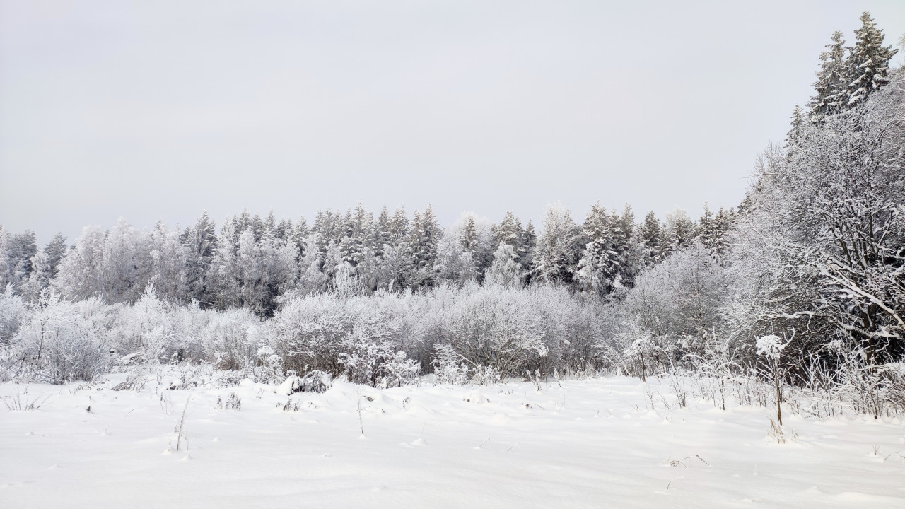 Фотография показывает заснеженное поле и линию смешанного леса на горизонте, где хвойные и лиственные деревья покрыты плотным слоем снега и инея. Низкое зимнее солнце отсутствует в кадре, что создаёт ровное рассеянное освещение, характерное для пасмурной погоды. Ландшафт указывает на северную или среднюю климатическую полосу, возможно в сельской местности вдали от населённых пунктов. Снимок может использоваться в материалах о климате, сезонности, туризме на природе или визуальном оформлении зимних тематик.