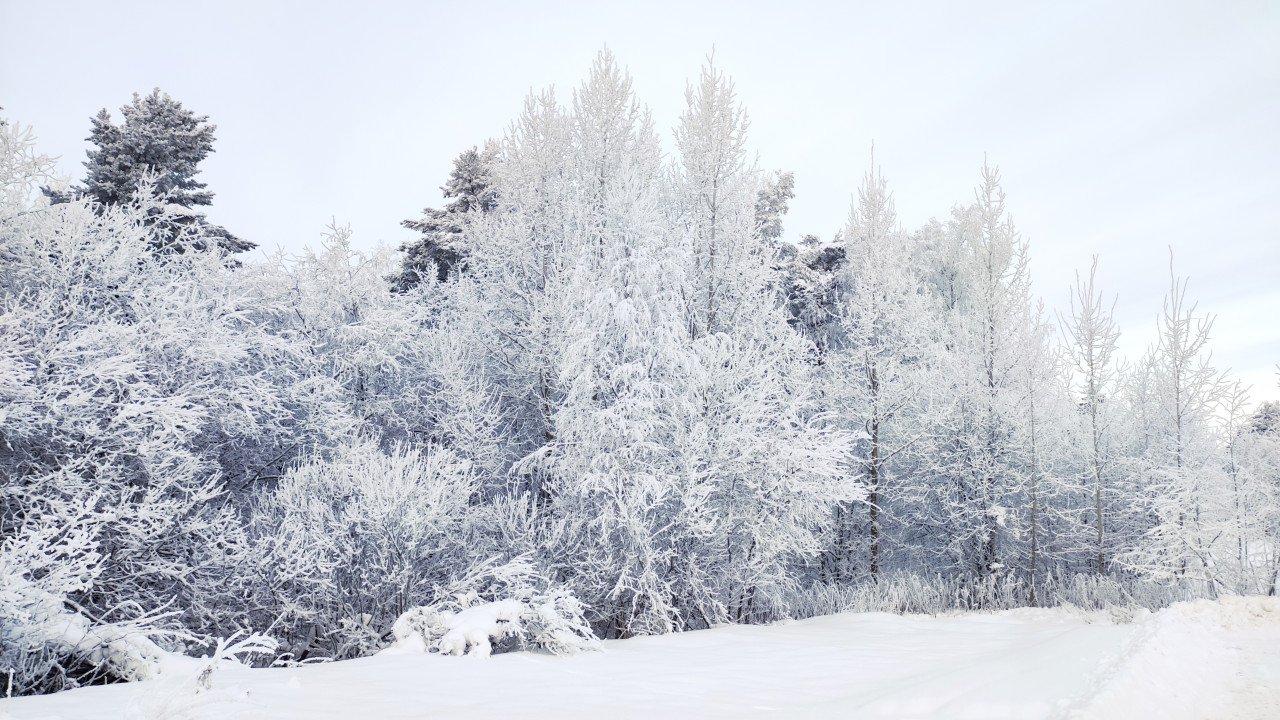 Фотография показывает плотный массив деревьев и кустарников, покрытых слоем инея и снега, сформировавших густую крону. На переднем плане заметен заснеженный участок обочины, указывающий на близость к транспортной инфраструктуре. Вид соответствует северному или умеренно-континентальному климату с устойчивыми низкими температурами. Историческая или культурная застройка в кадр не попадает. Снимок подходит для иллюстрации зимних природных условий, учебных материалов по климатологии и сезонных публикаций.