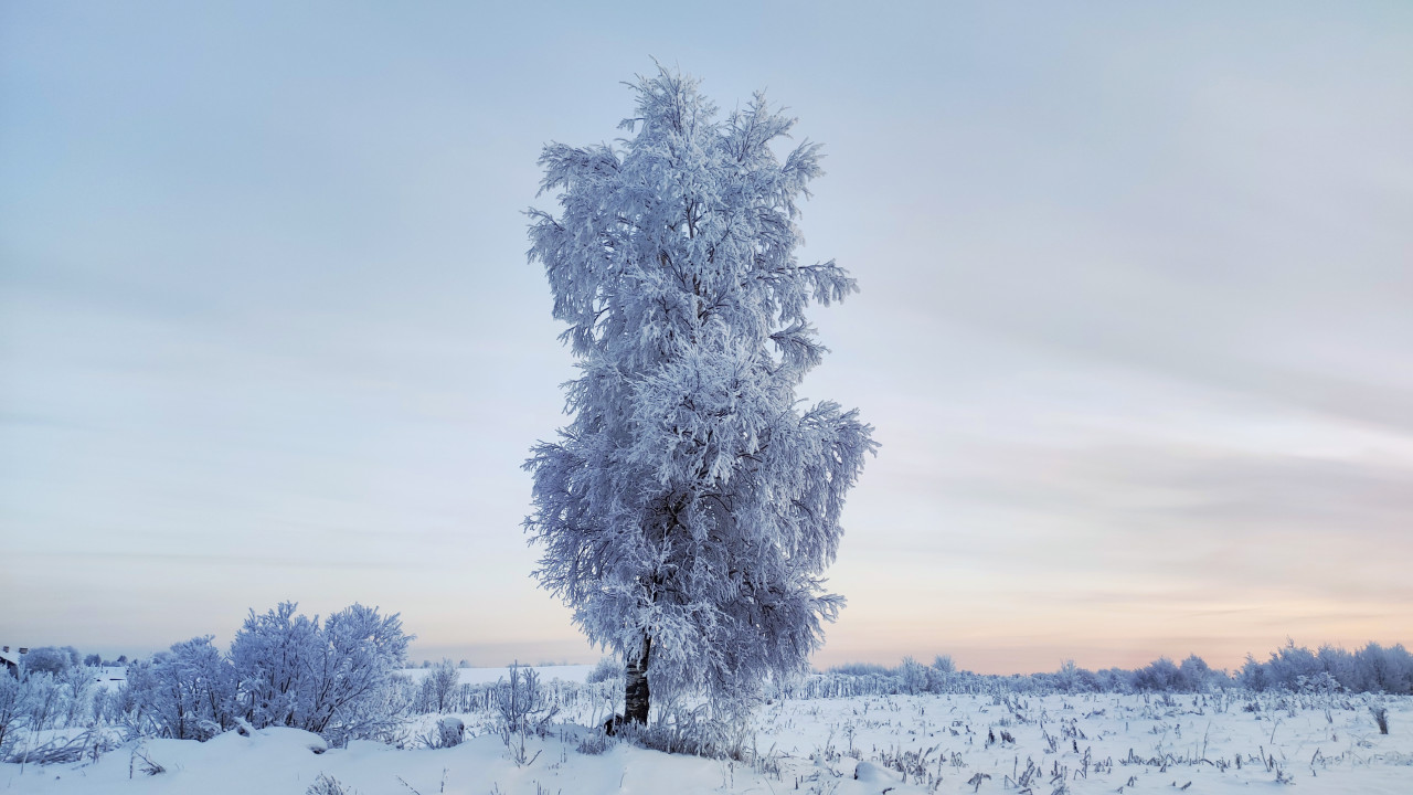 На фотографии изображено одиночное дерево, стоящее в открытом поле, полностью укрытое инеем и снегом. На горизонте видны низкие кустарники и деревья, растворяющиеся в лёгком тумане. Небо окрашено в мягкие оттенки розового и голубого, что указывает на вечернее время суток. Культурных или исторических объектов нет, композиция сосредоточена на природной сцене. Фото подходит для использования в темах одиночества, природной тишины, сезонных публикаций и ландшафтных исследований.