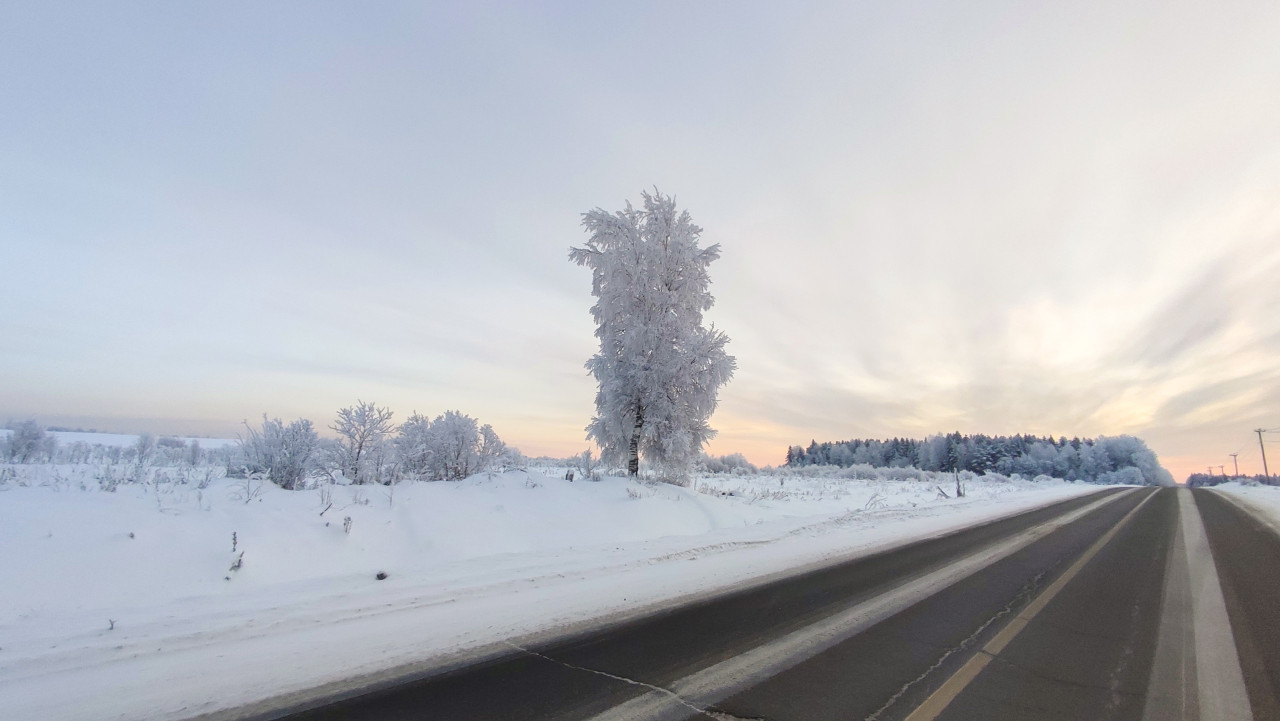 На снимке видно одиночное дерево, укрытое инеем, стоящее на возвышенности рядом с асфальтированной дорогой, уходящей в перспективу. Позади располагается заснеженное поле с низкой кустарниковой растительностью и полосой леса на горизонте. Небо окрашено в мягкие оттенки предзакатного света, что указывает на зимний период и устойчивый морозный климат. Исторических или культурных объектов в кадре нет. Фотография может использоваться для тем, связанных с сезонностью, транспортными маршрутами, зимними ландшафтами и дорожной инфраструктурой в сельской местности.