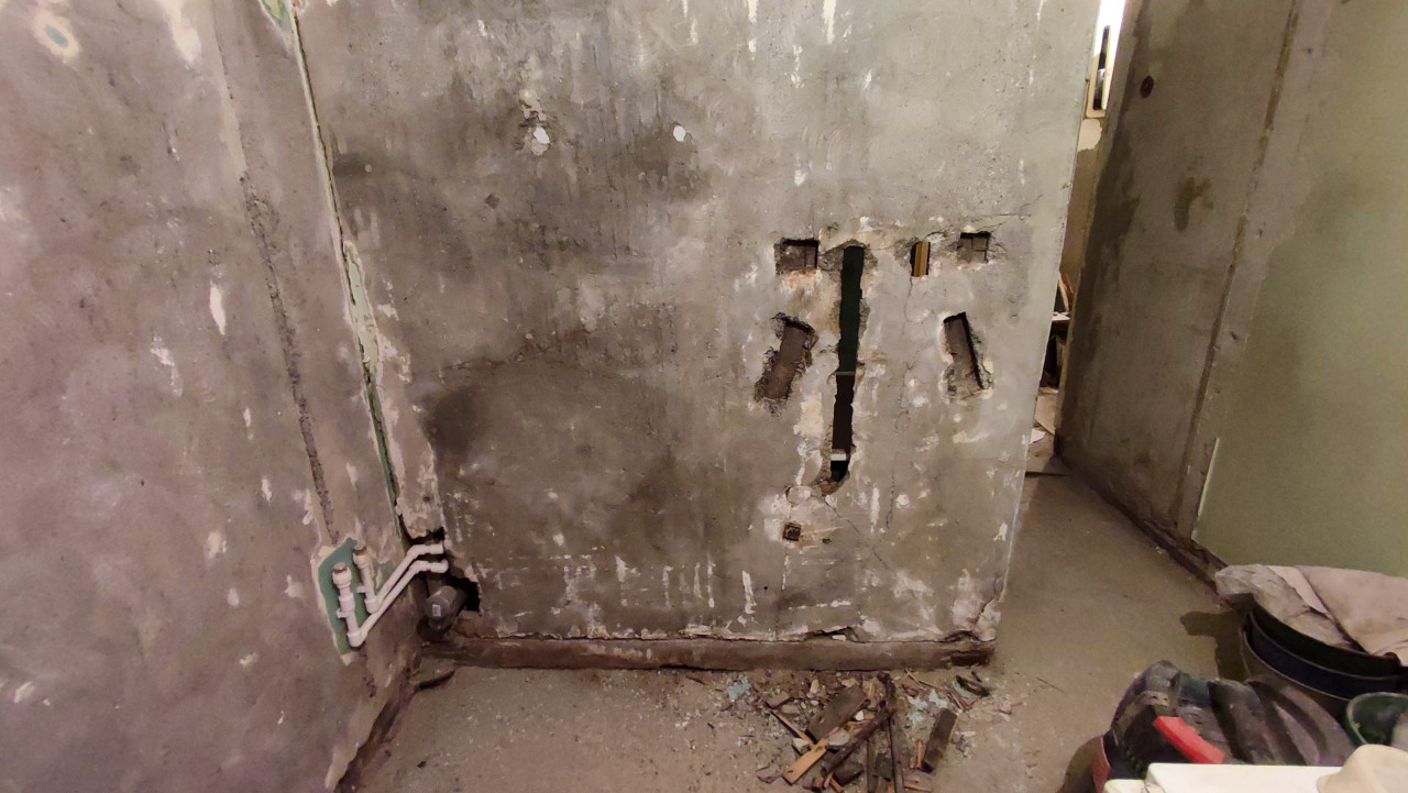 Изображение фиксирует крупный участок стены с прорезанными штробами под инженерные коммуникации, где отсутствует декоративное покрытие. В нижней части видна строительная пыль и обломки, по краю — следы старых труб и выведение новых соединений. Сбоку заметна часть смежного помещения, также на этапе ремонта. По архитектурным деталям можно предположить старую многоквартирную постройку типового проекта. Снимок подходит для материалов о скрытой прокладке коммуникаций, ремонте и реконструкции.
