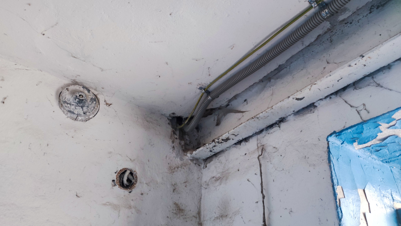 Участок угла помещения с открытой проводкой и следами старой штукатурки
