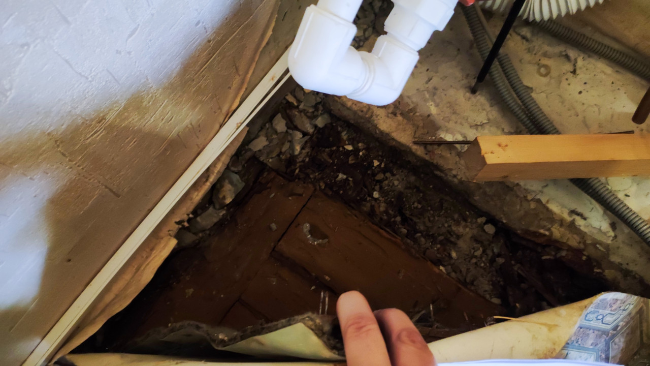 На изображении виден разобранный участок пола, расположенный возле трубы канализационного слива и подводящих коммуникаций. Под слоем линолеума и основания просматривается деревянное основание и строительный мусор. Фрагмент относится к обстановке жилой квартиры, следов исторической или культурной ценности нет. Снимок пригоден для материалов о ремонте, демонтаже и обследовании скрытых конструкций пола.