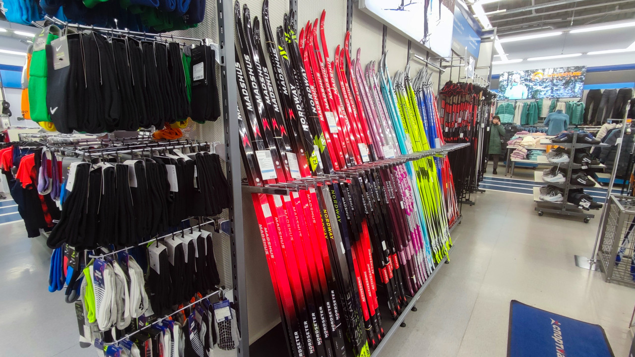 магазин спорттовары лыжи зимний спорт инвентарь снаряжение ассортимент покупка розничная торговля интерьер выбор шопинг экипировка стеллаж термоноски бренд подготовка к сезону трасса горнолыжный отдел беговые лыжи интерьер магазина спорт одежда перчатки сезонная продажа оборудование витрина полкиПохожие фотографии