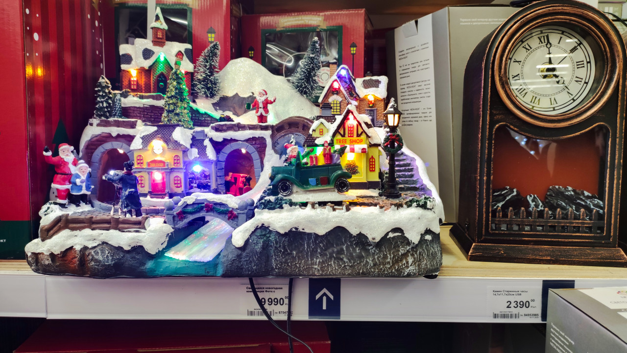магазин витрина новый год рождество декор игрушки праздничные товары интерьер украшения праздник зимняя тема оформление подарок новогодний декор композиция миниатюра рождественская деревня подсветка декоративный камин часы зимний пейзаж домики Санта Клаус интерьерное оформление сезонные товары украшение игрушка подсвеченный декор декоративная фигурка Новый год сувенир дом рождественская традиция праздничная атмосфераПохожие фотографии