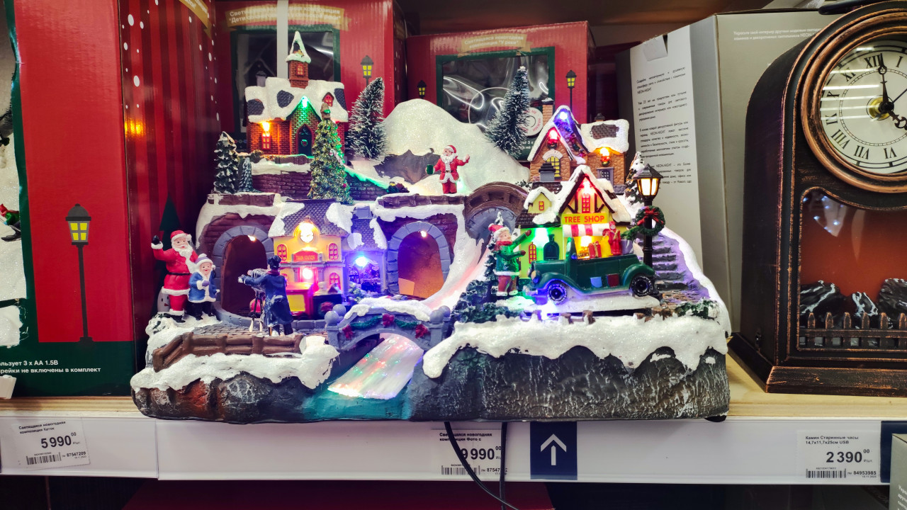 На фото размещена миниатюрная рождественская деревня с домиками, мостом, персонажами и светодиодной подсветкой, установленная на полке рядом с декоративными часами. Яркие огни и зимняя стилизация создают образ праздничного украшения для интерьера. Полка принадлежит отделу сезонных товаров в магазине. Фото может использоваться в материалах о новогоднем декоре и подборе интерьерных аксессуаров.