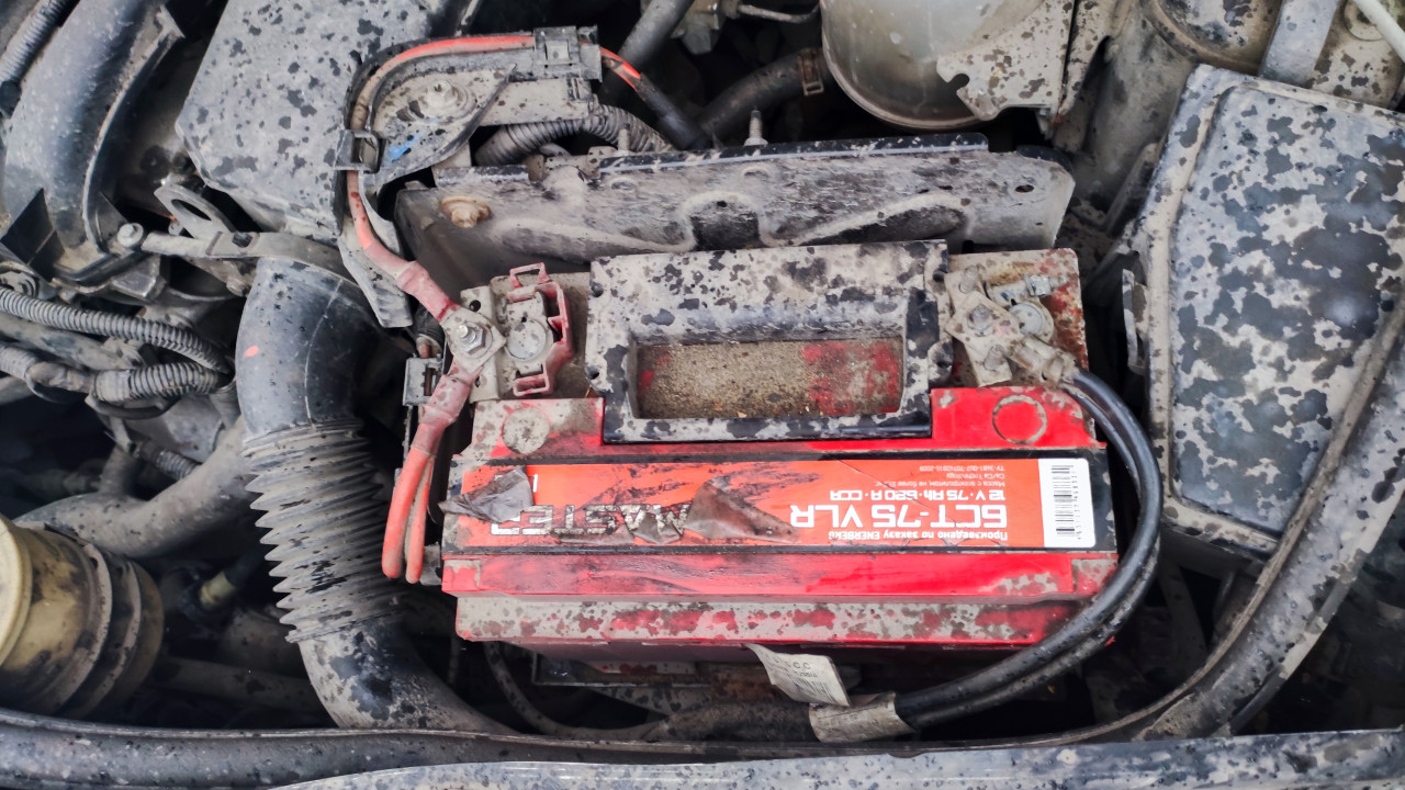 Автомобильный аккумулятор под капотом в грязном отсеке двигателя
