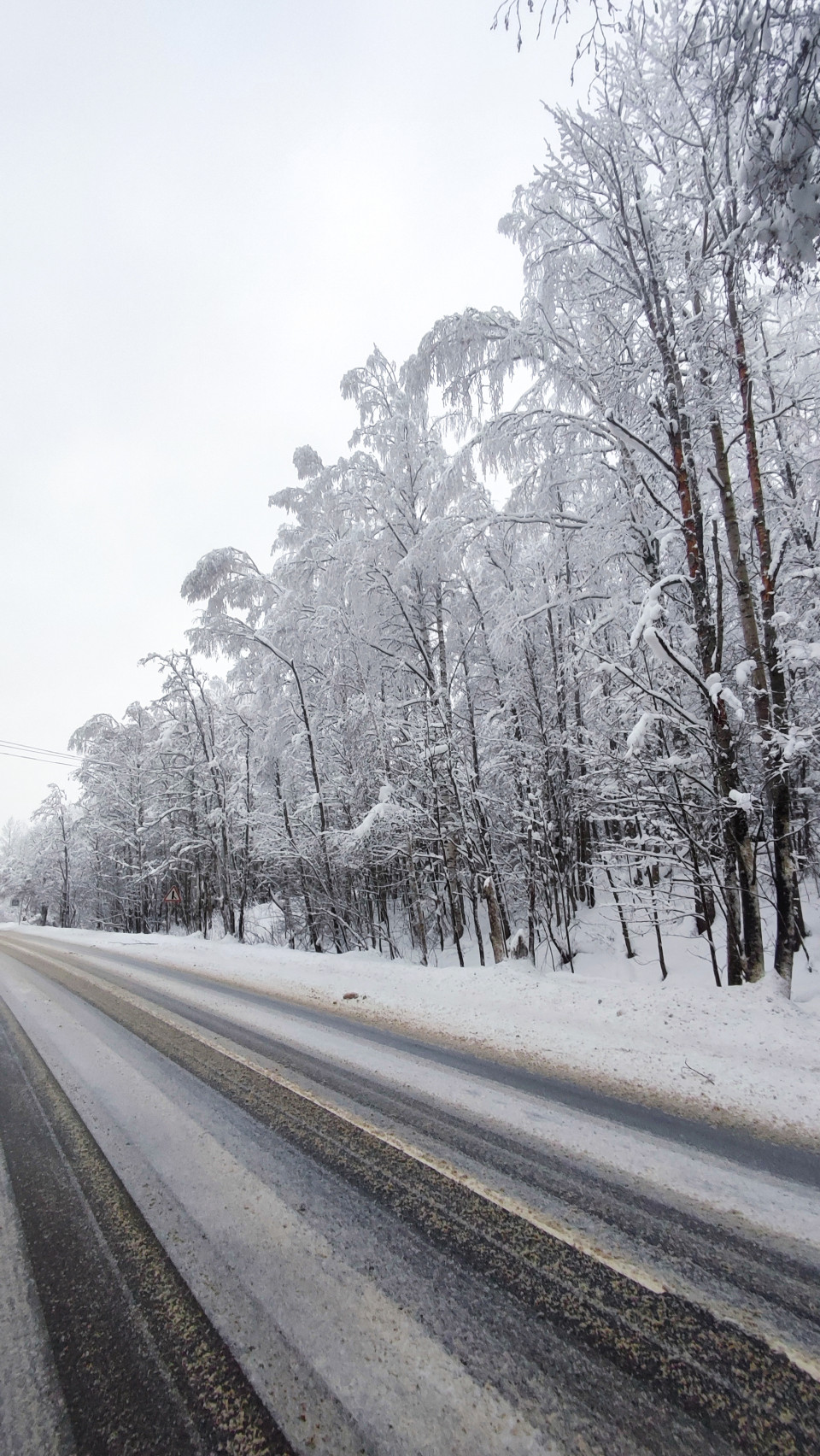 Снимок фиксирует проезжую часть в зимний период и прилегающий лесной массив, состоящий преимущественно из тонких лиственных стволов, полностью укрытых плотным снегом. Дорога покрыта остатками противогололёдной смеси и вытянутыми следами шин. Композиция показывает сезонную трансформацию ландшафта, типичную для заснеженных регионов умеренного пояса. Материал подходит для иллюстраций климатических условий, дорожной тематики, туристических справочников и публикаций о зимних поездках вдали от населённых пунктов.