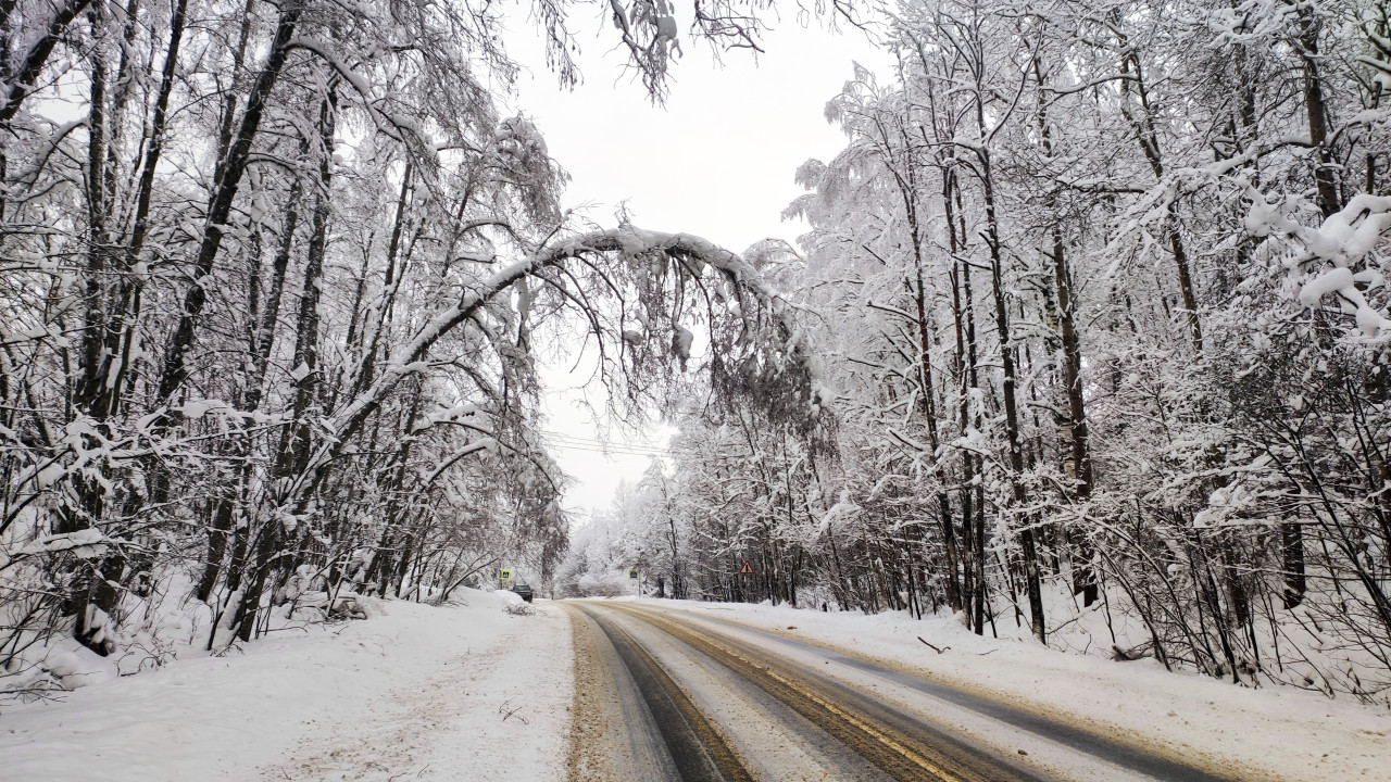 На фотографии показан загородный участок автомобильной дороги в зимний период, покрытый рыхлым снегом и следами автомобильных шин. Над полотном дороги дугой нависает крупная ветка лиственного дерева, согнутая под тяжестью снега. Дорожное полотно окружено густым лесом с плотным снежным покровом на ветвях и стволах. Вдали различимы дорожные знаки, указывающие на кривую и пешеходный переход. Снимок иллюстрирует сезонные особенности эксплуатации загородных трасс и может использоваться в публикациях о зимней погоде, безопасности движения и транспортной инфраструктуре.