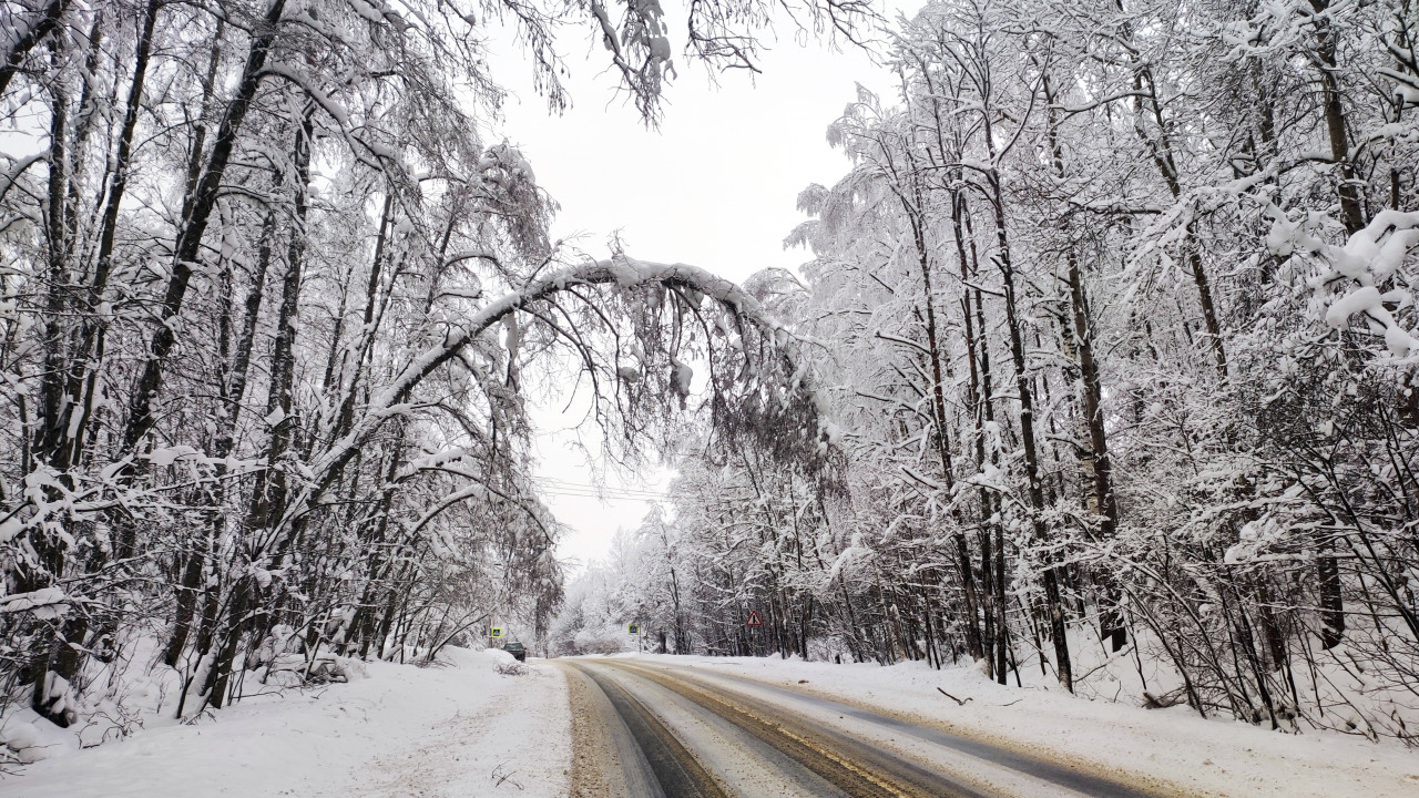 Изогнутая снежная крона над дорогой в зимнем лесу