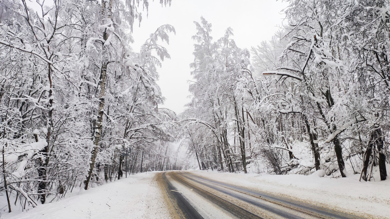 В кадре загородная трасса, пролегающая через густой заснеженный лес, стволы деревьев полностью покрыты снегом, а ветви формируют дугообразную арку над дорогой. Поверхность проезжей части очищена частично, на ней различимы следы шин и уплотнённый снег. Отсутствие населённых пунктов или инженерных сооружений указывает на удалённость от городской инфраструктуры. Снимок подходит для иллюстрации зимнего климата, природных условий и сезонной транспортной доступности.
