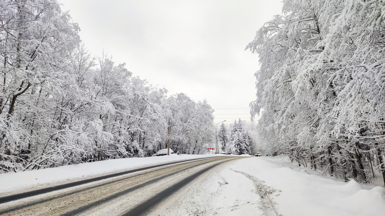 Зимняя трасса в пригороде, окружённая заснеженными деревьями