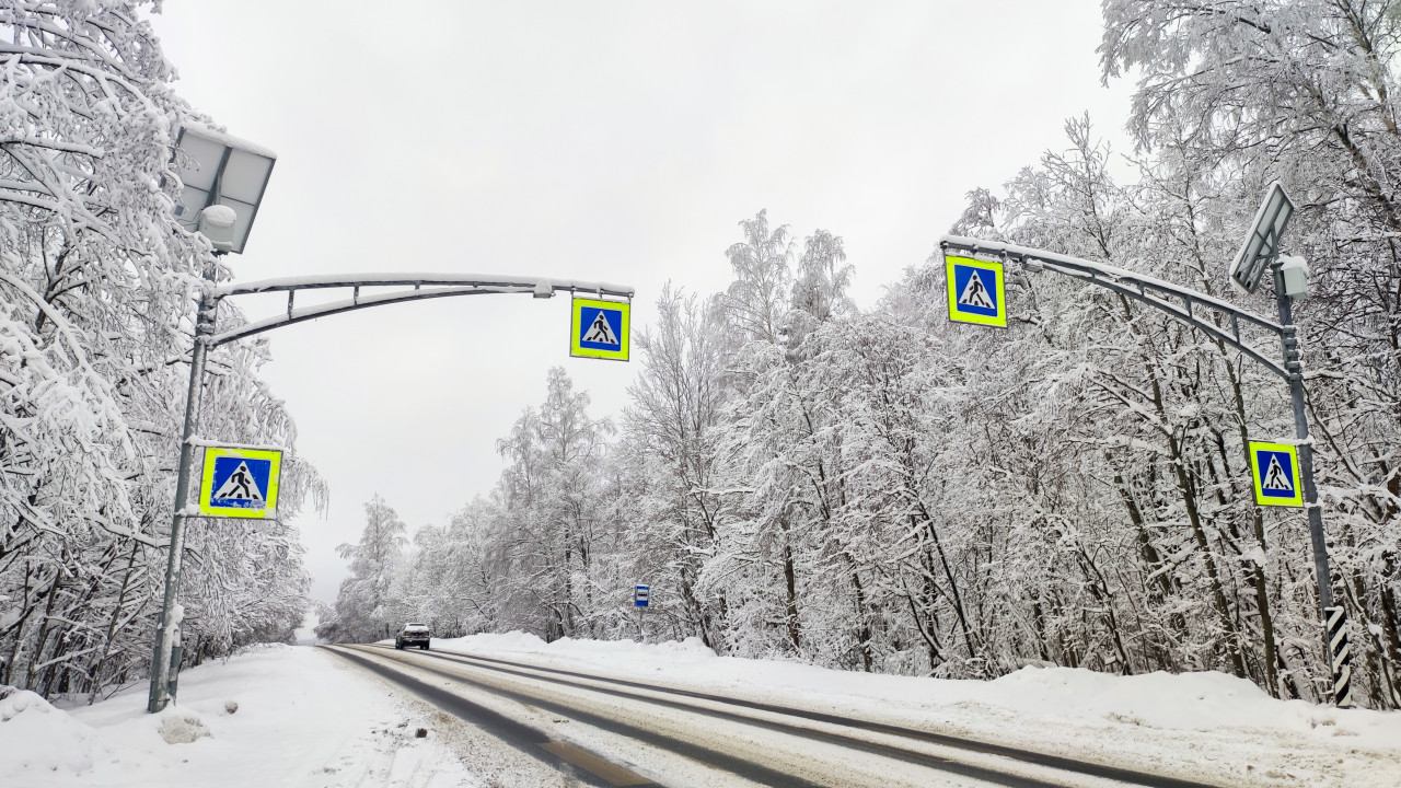 На снимке показан участок дороги с установленными над проезжей частью знаками пешеходного перехода, закреплёнными на дугообразных опорах и снабжёнными солнечными панелями. Обочину закрывают сугробы и плотные снежные кроны деревьев, что указывает на лесной район. Элемент инфраструктуры подчёркивает важность безопасного пересечения дороги в местах, где рядом может находиться небольшое поселение или остановка. Фотографию используют при создании материалов о дорожных нормах, зимней эксплуатации и адаптации переходов в сельских зонах.