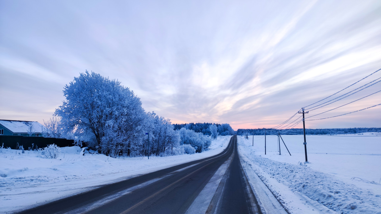 Кадр запечатлевает загородную дорогу, покрытую снегом и льдом, уходящую вдаль к лесному массиву. Справа проходит воздушная линия электропередачи на деревянных опорах, слева видны частные строения у кромки деревьев, также покрытых инеем. Освещение неяркое, характерное для короткого зимнего дня. Культурных или исторических объектов в кадре нет. Фотография подходит для иллюстраций о зимней инфраструктуре, энергетике и особенностях передвижения в холодный период.