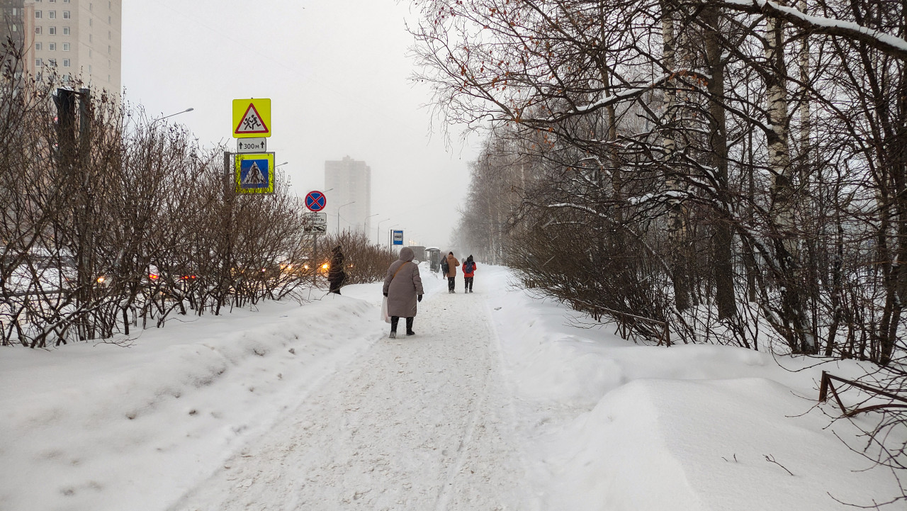 На снимке изображена заснеженная пешеходная дорожка вдоль улицы с голыми деревьями и кустарниками. Люди идут по утоптанному снегу в направлении автобусной остановки, видимой вдали. По левую сторону — жилые дома и проезжая часть с транспортом, по правую — полоса деревьев, вероятно, часть сквера или дворовой зоны. Фото демонстрирует типичный городской пейзаж зимнего мегаполиса и может использоваться в материалах о повседневной жизни и городской инфраструктуре.