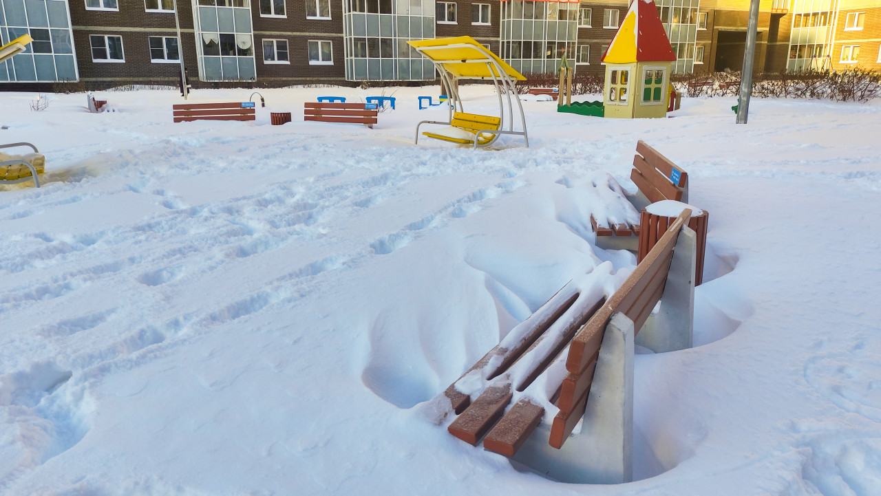 На фотографии изображена детская площадка, покрытая толстым слоем снега. Видны лавочки, частично занесённые снегом, жёлтые качели с навесами и игровая конструкция в виде домика. На заднем плане — фасады многоквартирных домов с застеклёнными лоджиями, характерные для современной жилой застройки России начала XXI века. Кадр передаёт зимнюю атмосферу двора в жилом районе. Фото подходит для материалов о городской среде, благоустройстве и климатических условиях северных регионов.