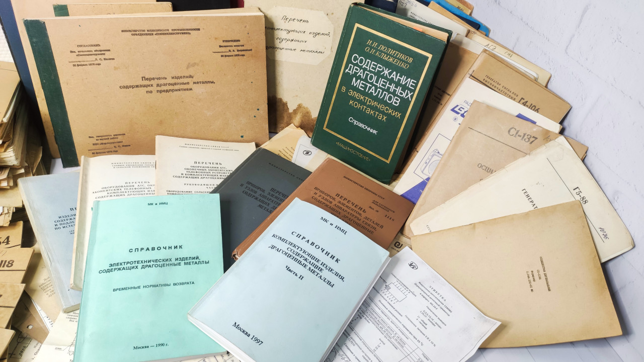 На снимке показаны отраслевые справочники и технические сборники конца XX века, разложенные на столе в виде архивной подборки. На обложках можно прочесть названия, посвящённые перечням деталей и оборудования, содержащих драгоценные металлы и применяемых в промышленности. Видны издания в мягком и твёрдом переплёте, а также каталожные папки и технические листы. Подобная документация использовалась заводами и конструкторскими бюро для нормирования и расчёта материалов. Снимок подходит для публикаций о промышленной истории и бумажном документообороте.