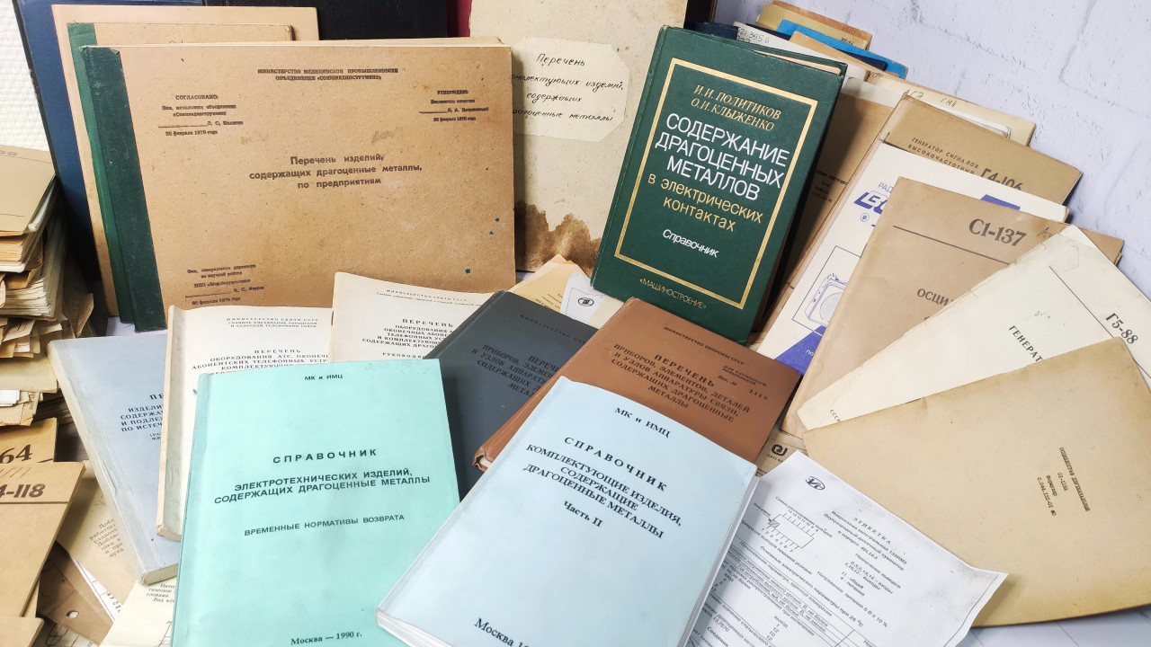 На изображении разложена подборка справочников, ведомственных инструкций и перечней, посвященных комплектующим и электроизделиям, содержащим драгоценные металлы. На переднем плане видно несколько отраслевых изданий разных цветов и формата, за ними — каталожные папки с маркировками. Эти документы представляют бумажный фонд, использовавшийся предприятиями периода позднего СССР для технического учёта и нормирования материалов. Кадр может использоваться в образовательных и историко-технических материалах о промышленной документации.