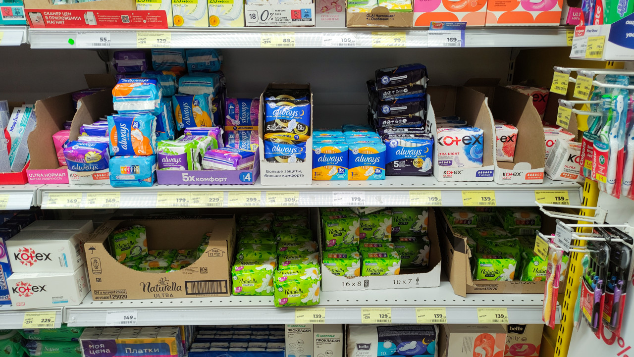 Полка с женскими гигиеническими товарами в супермаркете