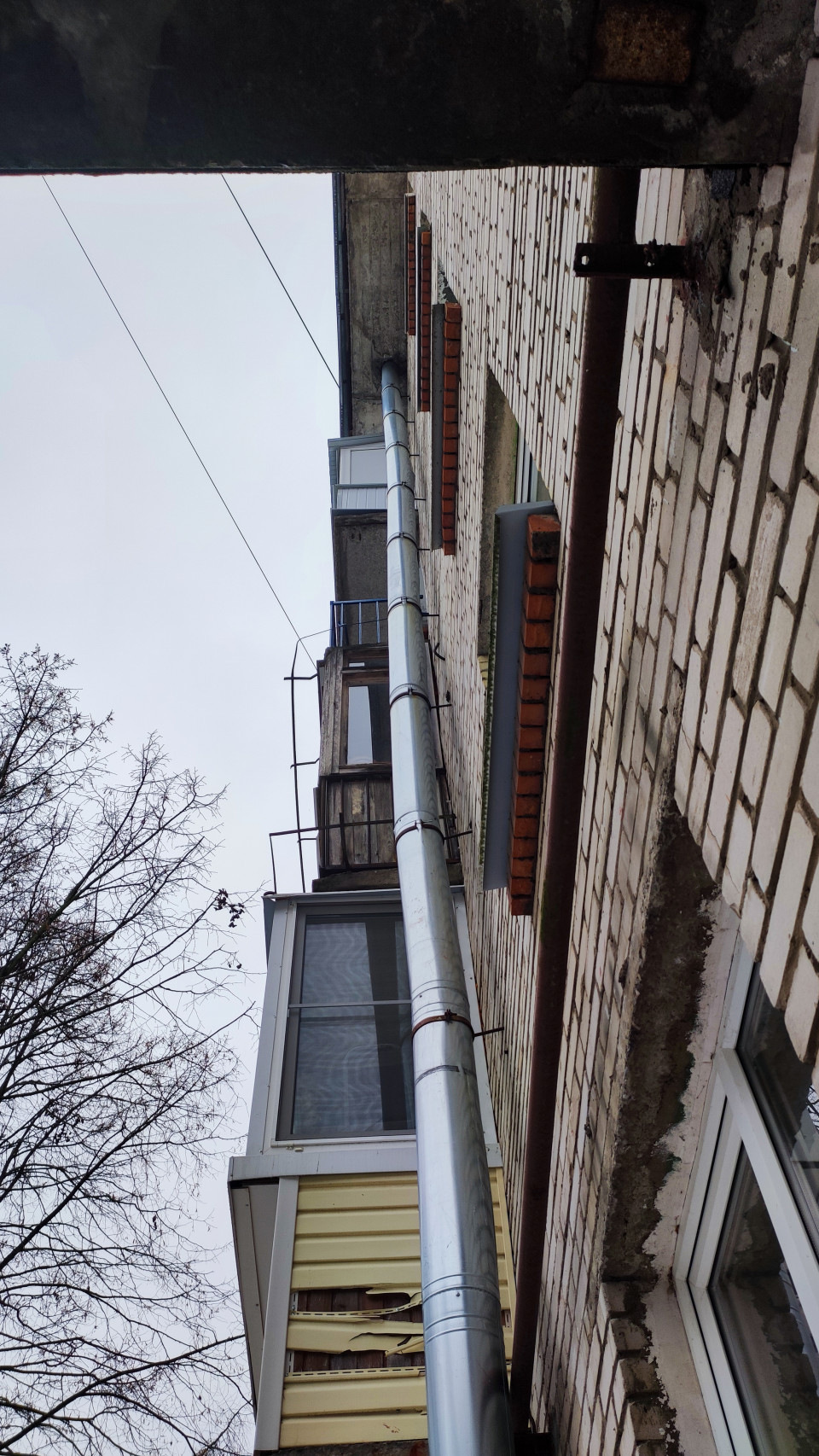 На фото изображён фрагмент фасада пятиэтажного кирпичного дома с металлическим водостоком, проходящим вдоль балконов. Съёмка выполнена снизу вверх, что подчёркивает высоту здания и детали его конструкции. На фасаде заметны следы ремонта и эксплуатации, а также застеклённые балконы разного типа. Снимок может использоваться для публикаций об архитектуре советского периода, инженерных решениях и проблемах сохранения жилого фонда.