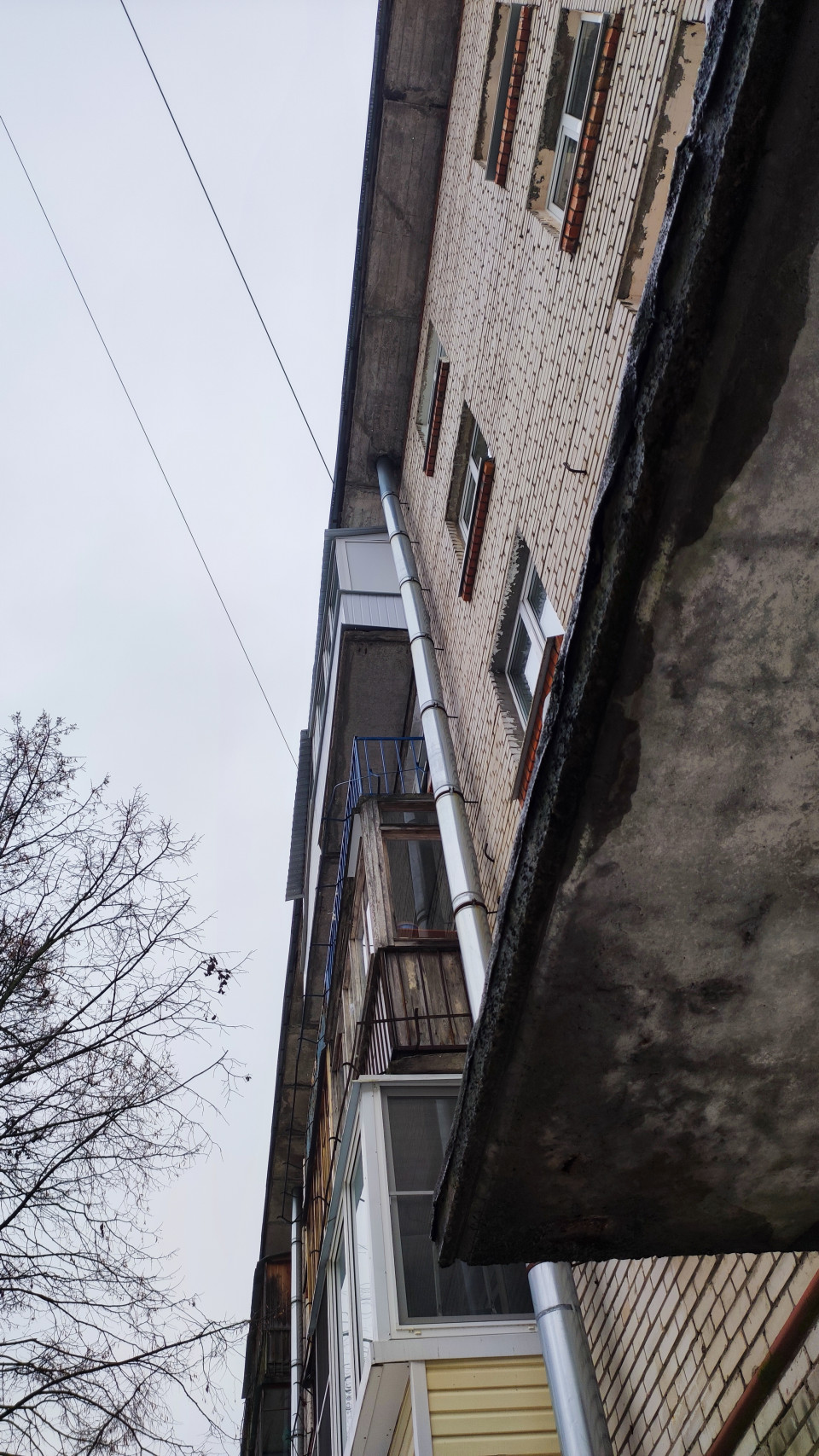На изображении показан жилой пятиэтажный дом советской постройки, снятый под углом снизу вверх. Видны балконы с металлическими перилами, застеклённые лоджии и водосточная система, идущая вдоль фасада. Состояние некоторых конструкций указывает на длительный срок эксплуатации здания. Фото можно использовать для материалов об архитектуре, техническом состоянии домов и типовых жилых сериях середины XX века.