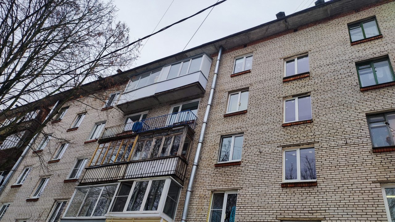 На фотографии изображён фасад типового жилого дома, построенного из светлого кирпича. Видны застеклённые и открытые балконы, металлические перила, водосточная труба и оконные проёмы с пластиковыми рамами. Этот тип зданий характерен для массового жилищного строительства 1960–1980-х годов в СССР. Снимок подходит для материалов об архитектуре послевоенного периода, городской застройке и жилищном фонде старых районов.