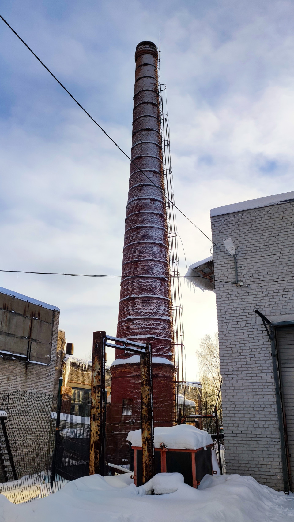 На изображении показана высокая кирпичная промышленная труба, покрытая снегом и наледью, расположенная рядом с производственными зданиями. В кадре присутствуют металлические конструкции старой инфраструктуры и забор, а также трубы и элементы обслуживания. Кирпичные дымовые трубы подобного типа широко применялись на промышленных объектах XX века для отвода продуктов сгорания. Объект не имеет статуса культурного наследия и относится к технологическим сооружениям заводских территорий. Снимок подходит для статей и материалов о промышленных локациях и инженерной инфраструктуре.